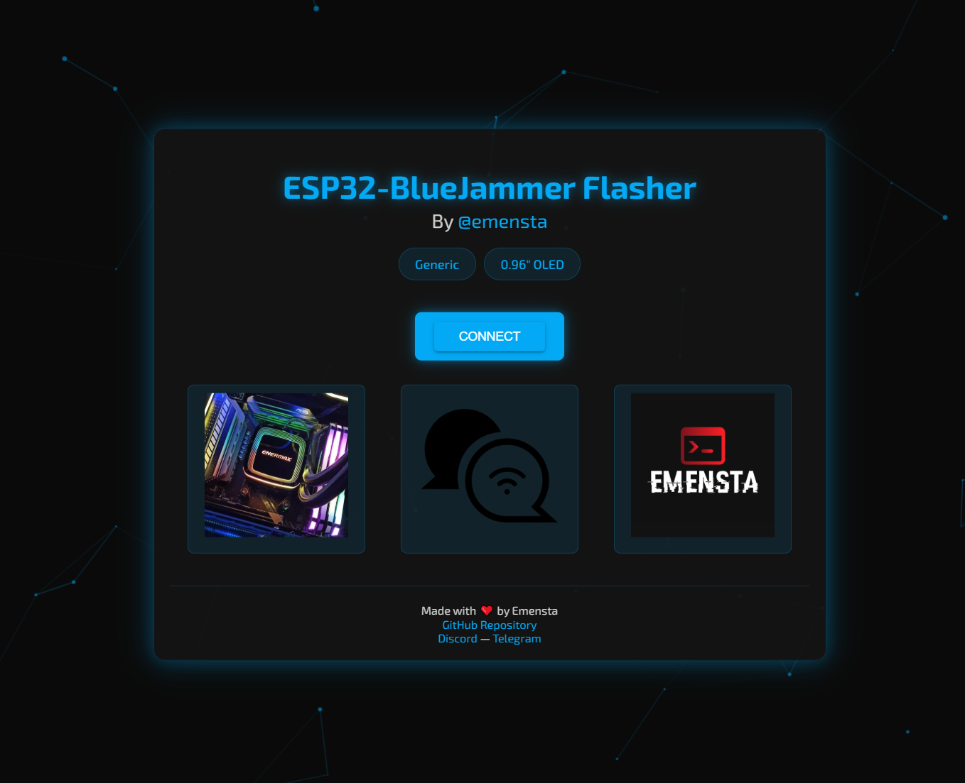 I've created a webflasher to make it super easy for you to flash your ESP32 chip with the ESP32-BlueJammer firmware of your choice!